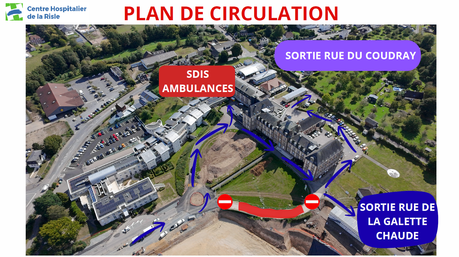 - Accès depuis la route de Lisieux et au rond dans l’enceinte du CH de la Risle, prendre la deuxième sortie (initialement sens de descente, flèche bleu sur l’image)